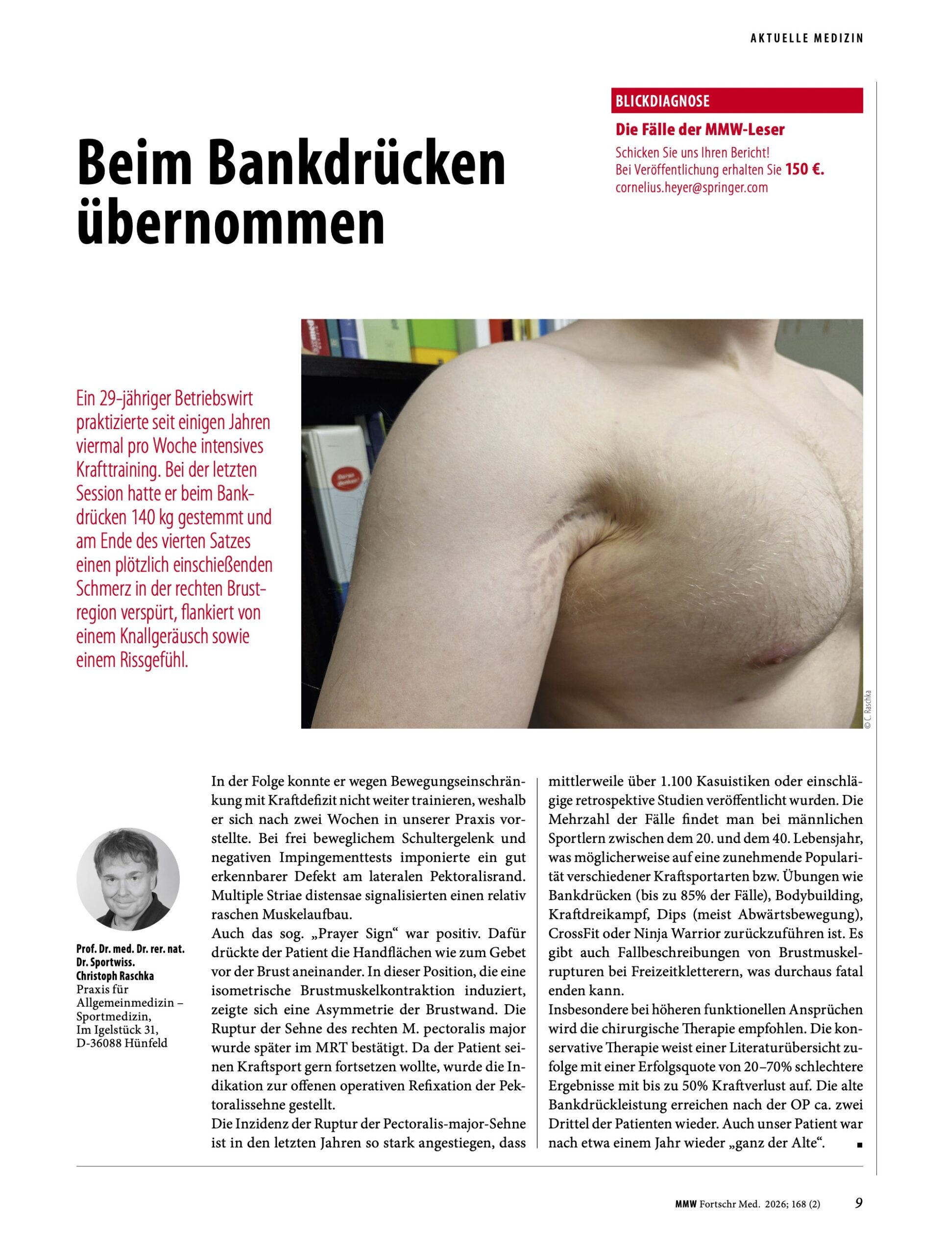 Ein 29-jähriger Betriebswirt praktizierte seit einigen Jahren viermal pro Woche intensives Krafttraining. Bei der letzten Session hatte er beim Bankdrücken 140 kg gestemmt und am Ende des vierten Satzes einen plötzlich einschießenden Schmerz in der rechten Brust- region verspürt, flankiert von einem Knallgeräusch sowie einem Rissgefühl.…