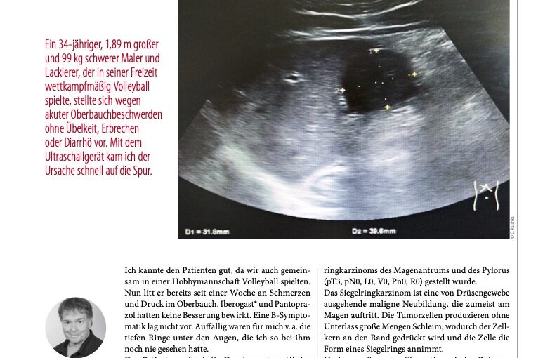 Ein 34-jähriger, 1,89 m großer und 99 kg schwerer Maler und Lackierer, der in seiner Freizeit wettkampfmäßig Volleyball spielte, stellte sich wegen akuter Oberbauchbeschwerden ohne Übelkeit, Erbrechen oder Diarrhö vor. Mit dem Ultraschallgerät kam ich der Ursache schnell auf die Spur. …